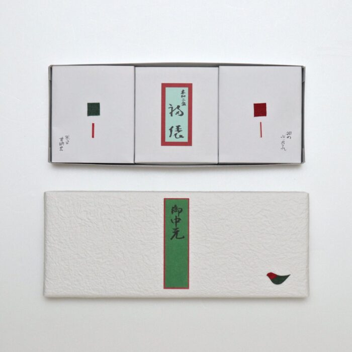 昨年から販売しておりますお菓子3種の詰め合わせギフトです。本和三盆100%の福俵は色合いが涼し気な期間限定「青色福俵」の組み合わせがおすすめです。