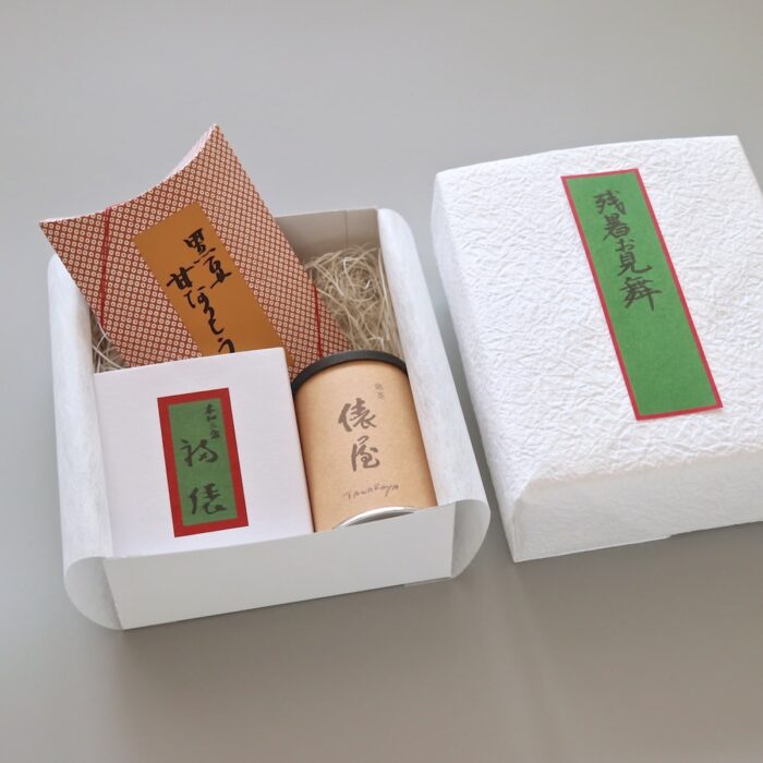 夏には冷茶でも美味しくお召し上がり頂けます。お菓子はぶぶあられ、福俵、黒豆甘なっとうのいずれかよりお選びください。