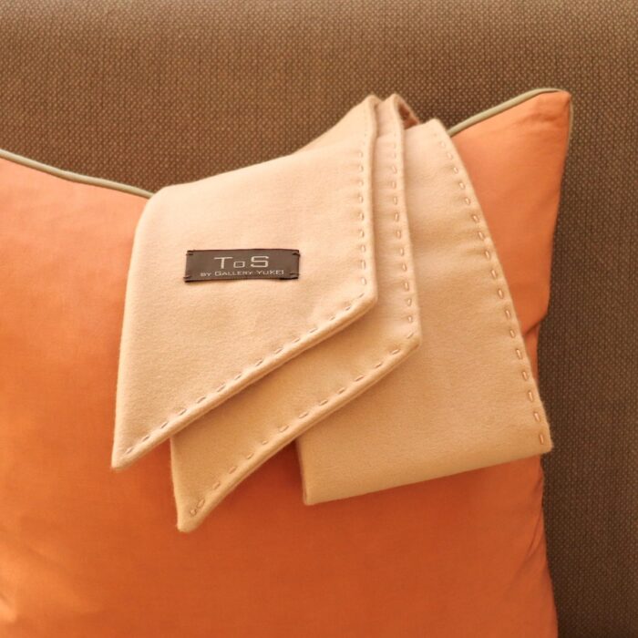 カシミヤ・タイと同素材で仕上げた遊形オリジナルマフラー。毛羽立ちは少なくツヤがあり、軽くてとても温かく、肩に掛けるだけで見栄えします。ジャケットやコートにも合わせやすいサイズ感に仕上げております。男女問わずおすすめいたします。※1点ずつ手仕事の為、お日にちを頂戴する場合がございます。