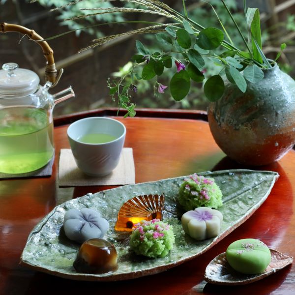 桔梗餅(ういろ)、一重草(こなし)、こぼれ花(こなし)