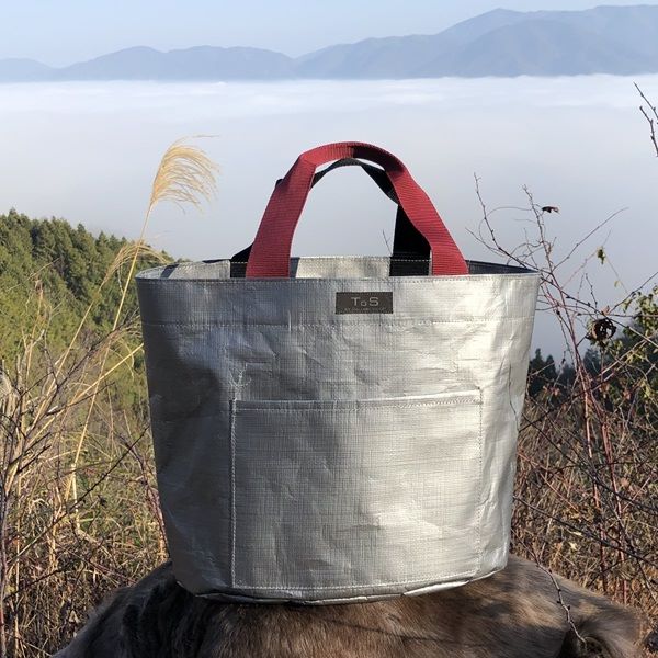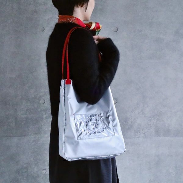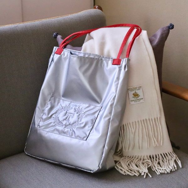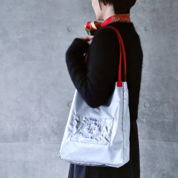 シルバーの本体に、バイカラーの持ち手が印象的なトートバッグ。