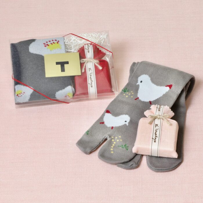 鳩と椿の可愛らしい柄が目を引く足袋型の靴下と石鹸をセットにしました。