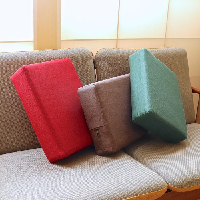 座椅子や洋イスの腰当てに、または座面の高さ調整にも使って頂けます。中材は硬めのウレタンを使用しており、ヨガ等のフィットネスにもおすすめです。