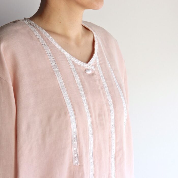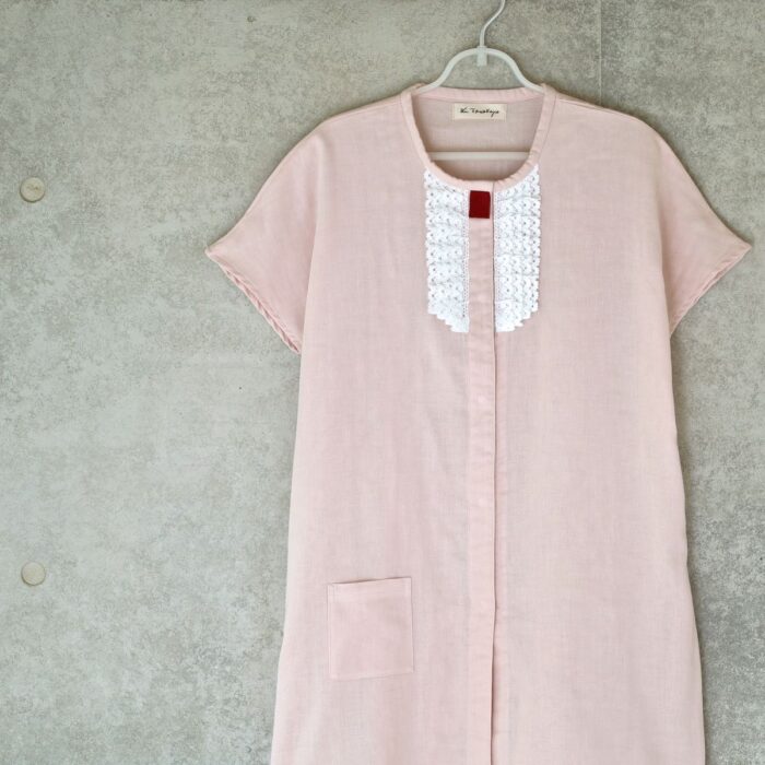 オリジナル二重ガーゼは、柔らかく軽やかで春夏秋におすすめです。お洗濯を繰り返すほどに柔らかさが増し、使いこなした後の肌合いが心地よい生地です。シンプルな胸元のレースがポイントです。