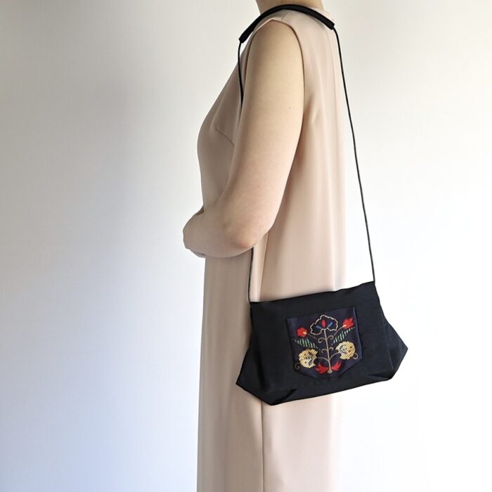 とても軽く、上品なショルダー・ポーチで革紐は長さの調整や取りはずしも可能でクラッチバッグとしてもお使いいただけます。和服、洋服どちらにも合わせやすいデザイン。