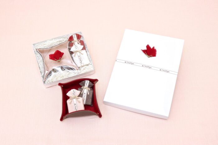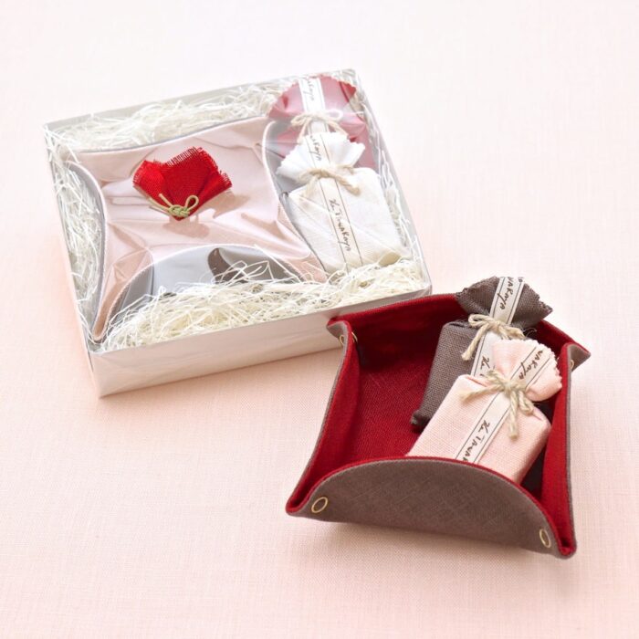 ご旅行の際にもコンパクトにお持ちいただけるジュエリー・トレイとソープポプリ(石鹸1個入)×2の特別セットです。カーネーションを添えたラッピングでお届けいたします。