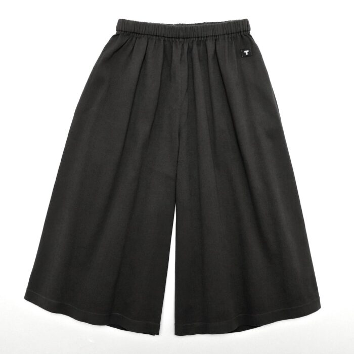 膝下丈のフレアパンツ。バランスが取りやすく夏の着回しに重宝いたします。