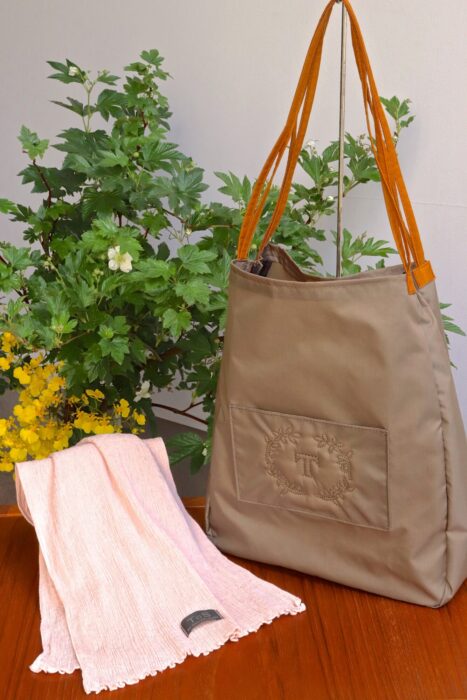 4本の細い持ち手とポケット刺繍がポイントで、日頃のお買い物やご旅行時のサブバッグにおすすめです。