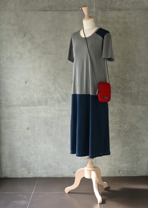 膝の隠れる長めの丈で、お部屋着やお出かけにも1枚でお召しいただけます。色が腰位置より切り替わることでスタイルをよく見せます。